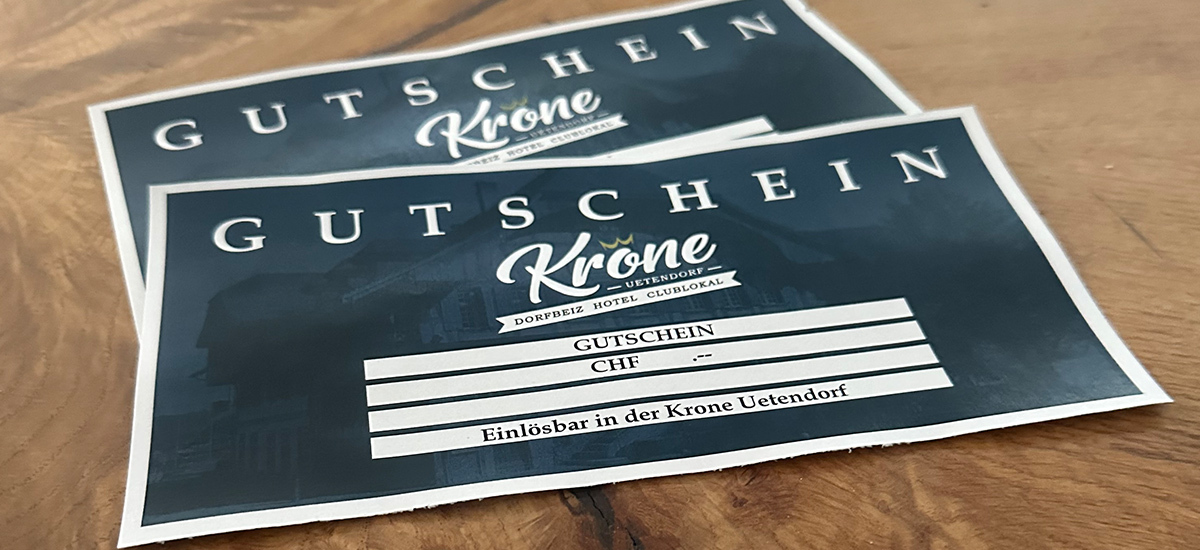 Schenken macht Freude! Gutscheine können in der Krone Uetendorf gerne online bestellt werden und wir lassen Dir diese mit separater Post und der entsprechenden Rechnung so rasch wie möglich zukommen. Gegen Aufpreis von CHF 5.-- kannst Du den Gutschein auch gleich an eine Empfängeradresse (z.B. als Firmengeschenk) verschicken lassen, bei mehreren Gutscheinen an mehrere Empfänger nehmen wir Listen gerne auf info@krone-uetendorf.ch entgegen.